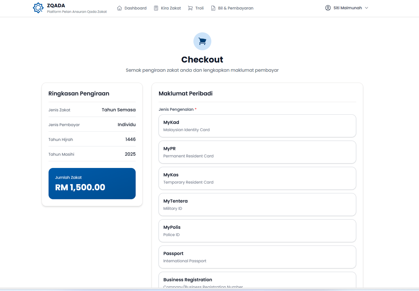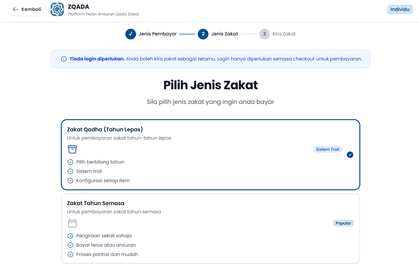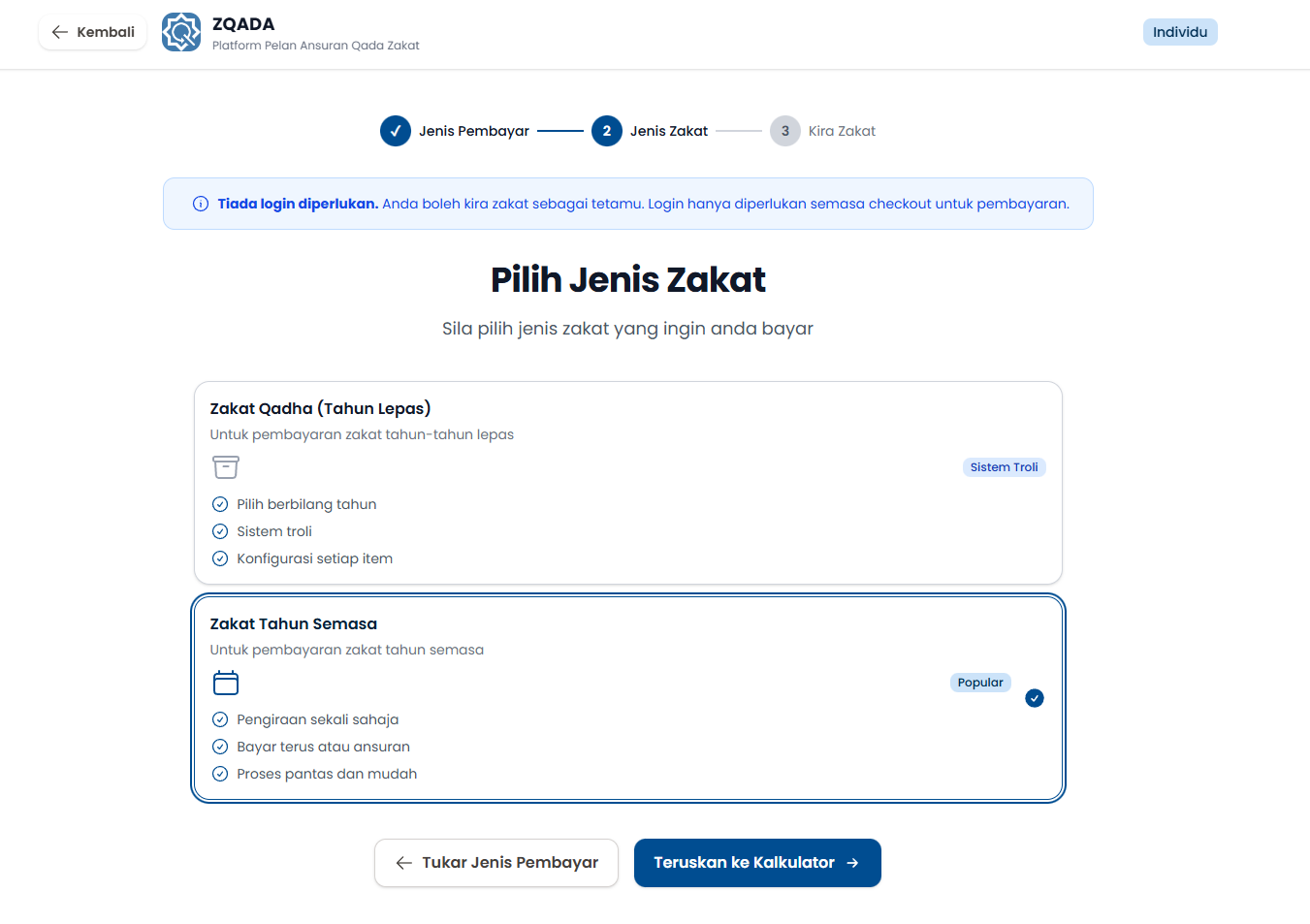 Langkah 4: Pilih Jenis Zakat (Zakat Qadha/Zakat Tahun Semasa).