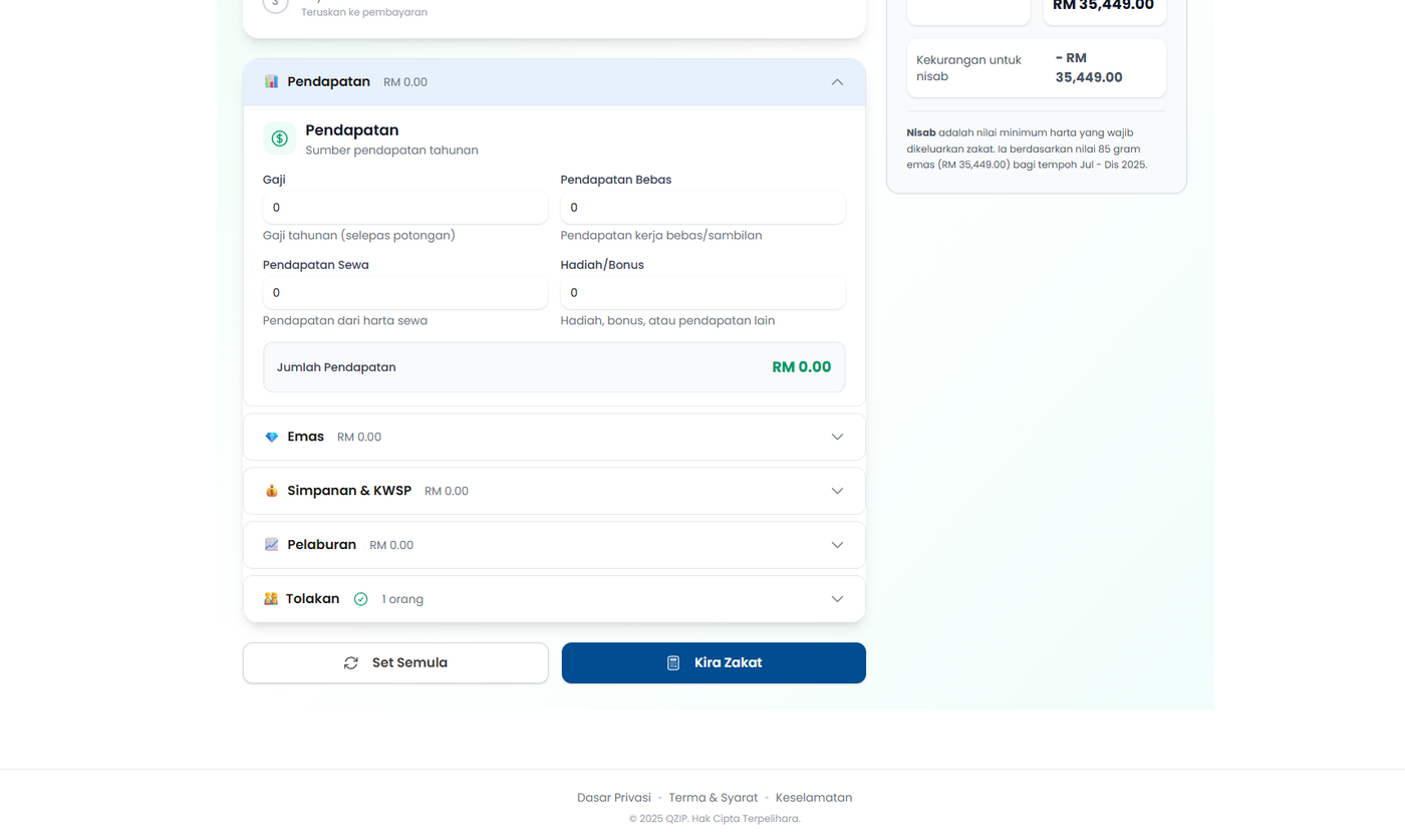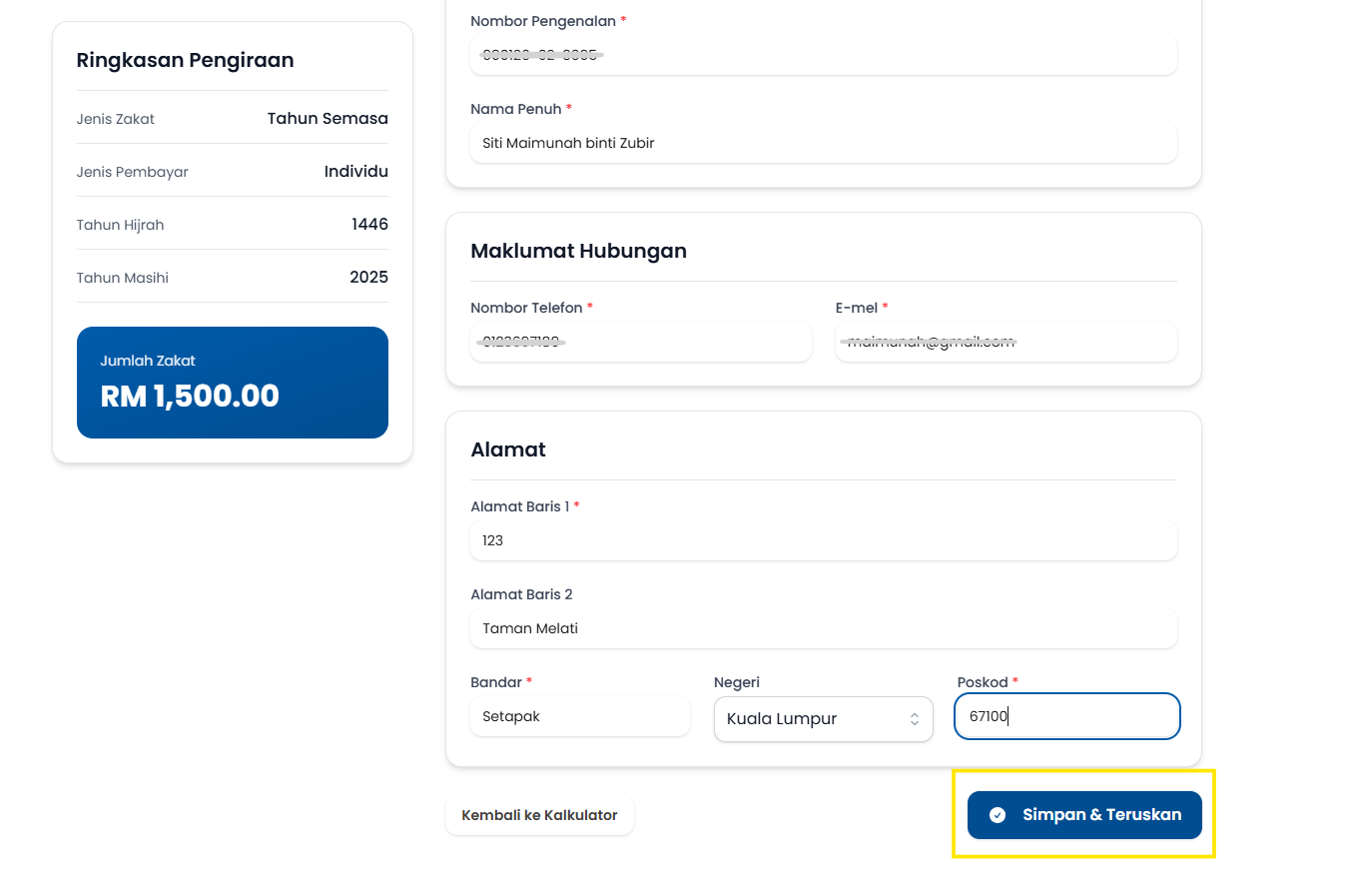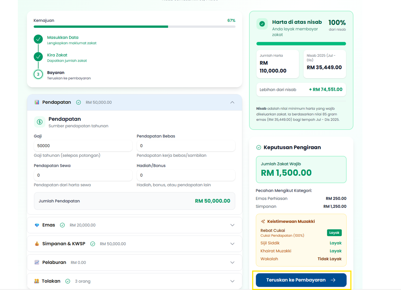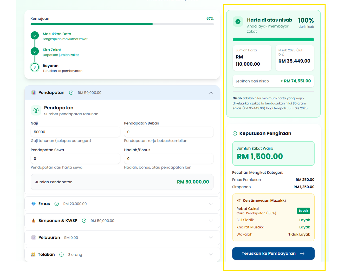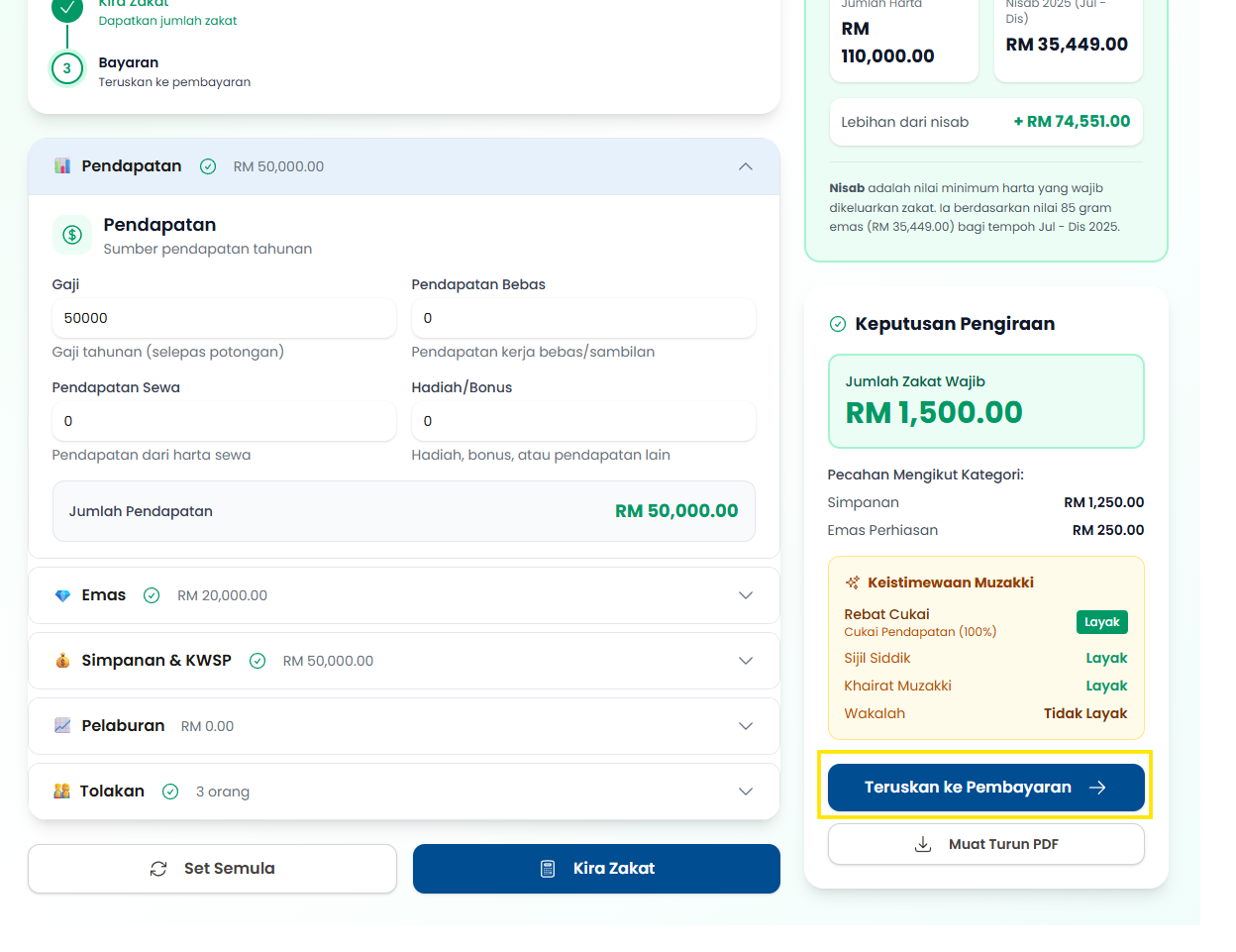 Langkah 3: Tekan butang Kira Zakat untuk melihat Keputusan Pengiraan dan Keistimewaan Muzakki.