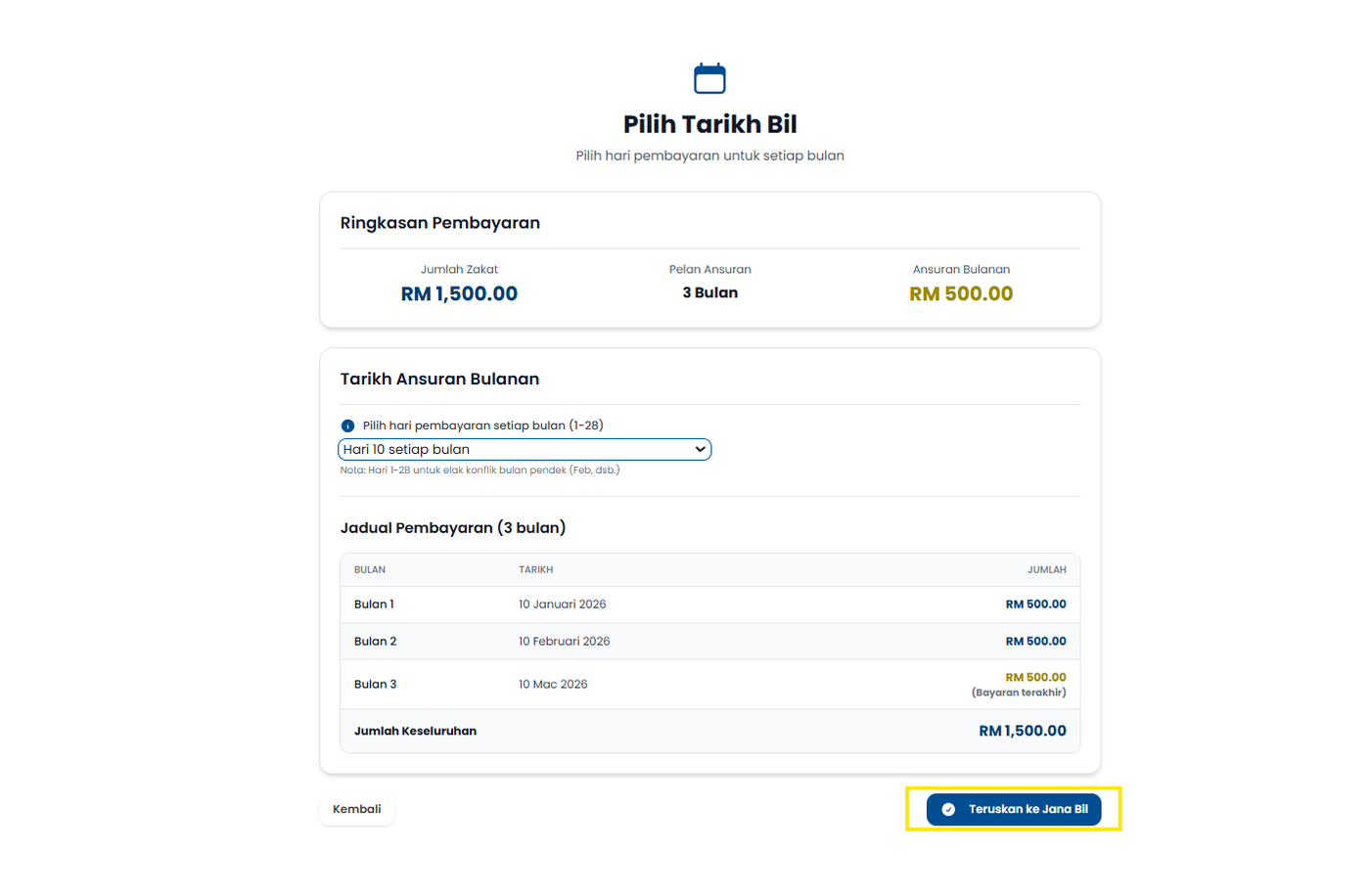 Langkah 3: Tekan butang Teruskan ke Pengiraan Zakat.