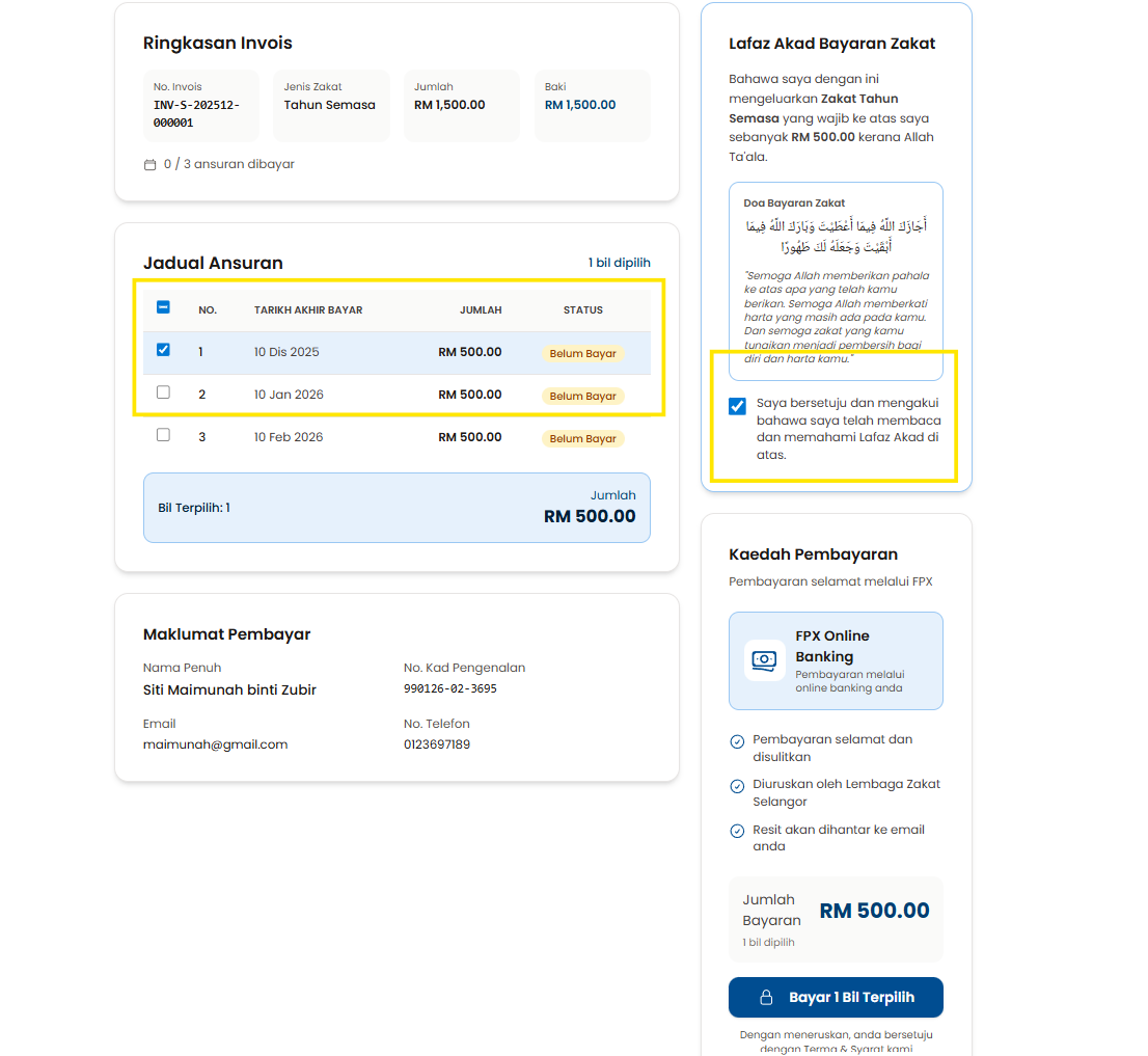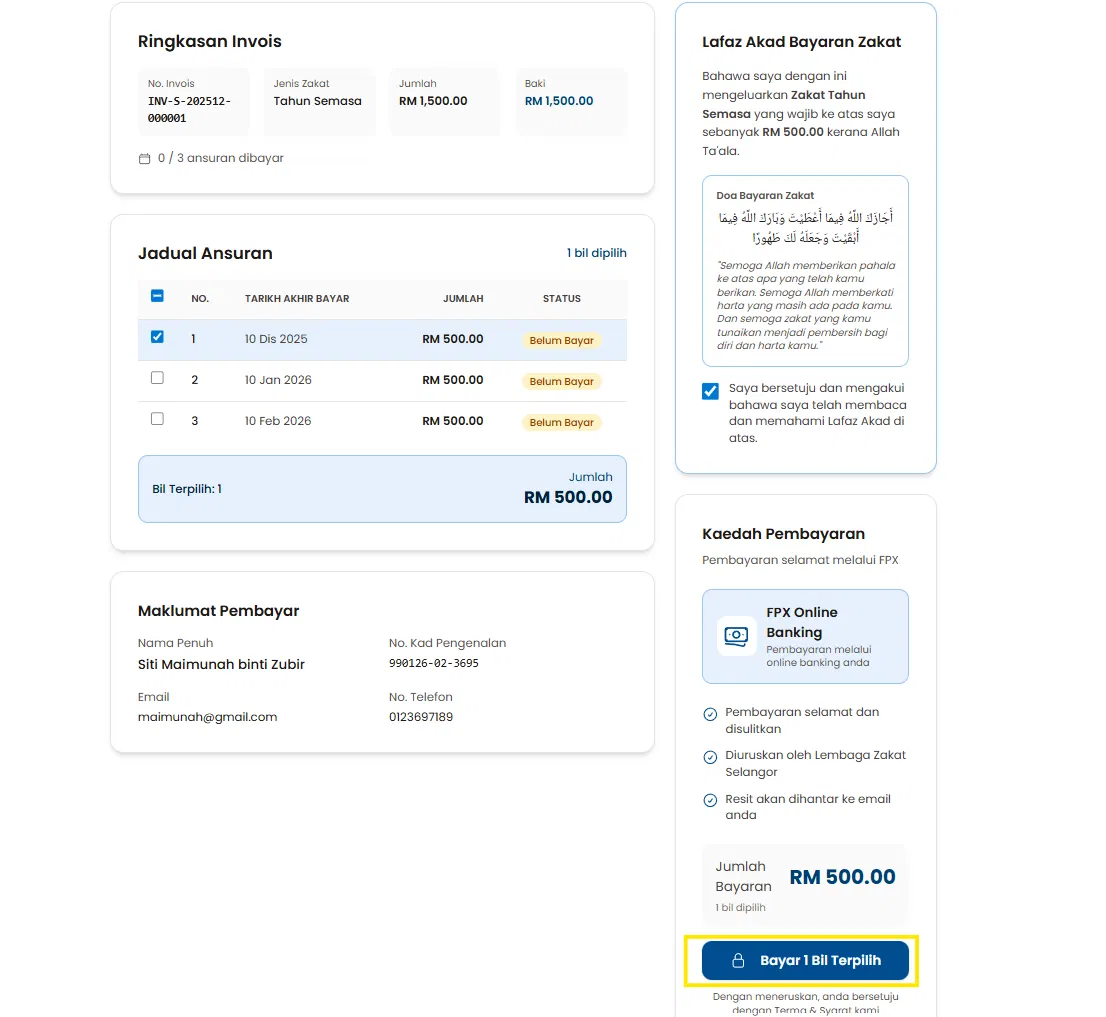 Langkah 10: Pilih bil yang ingin dibayar dan klik pada checkbox di ruangan Lafaz Akad Bayaran Zakat.