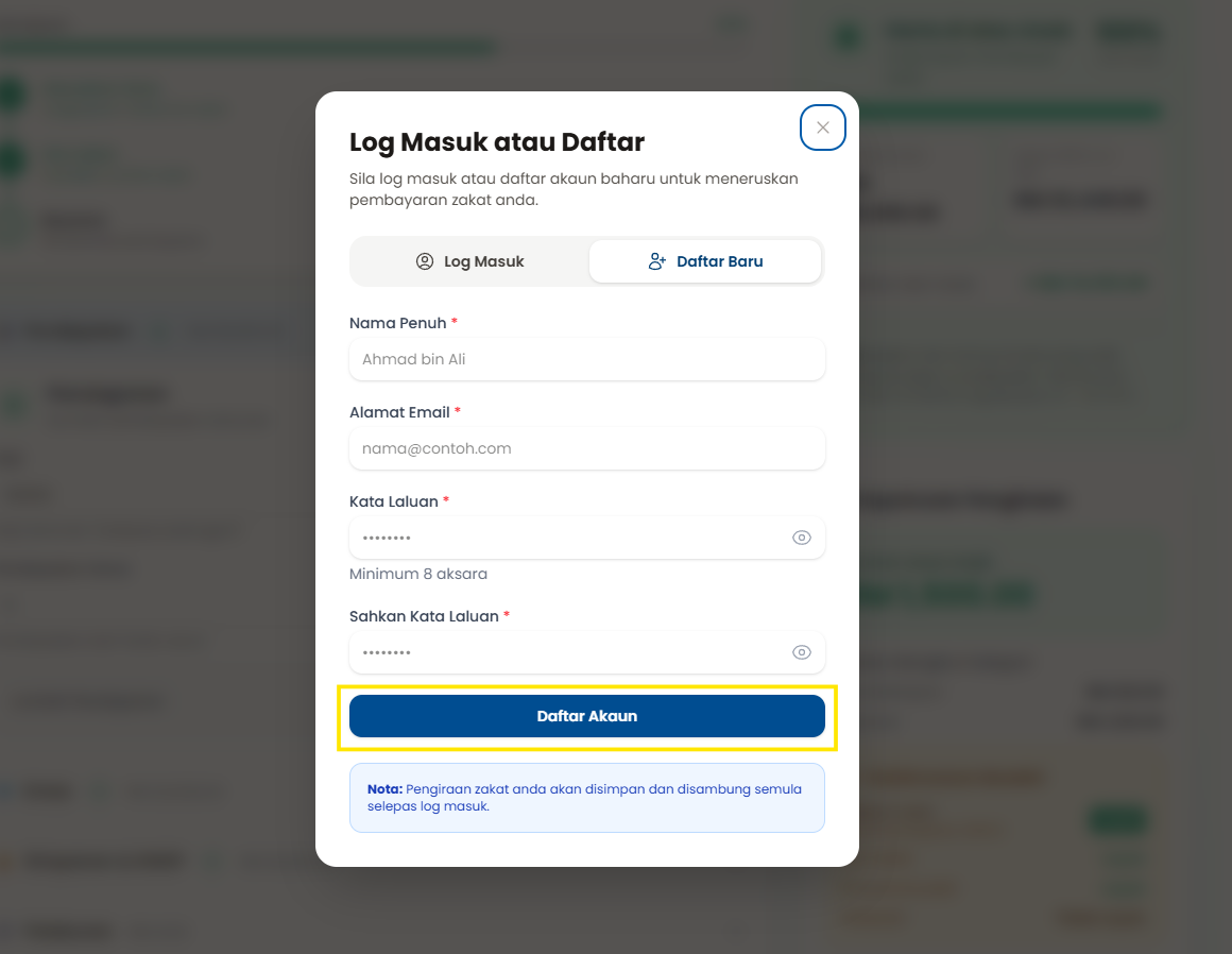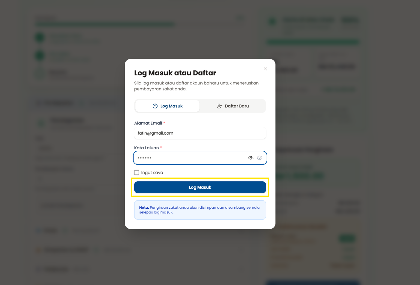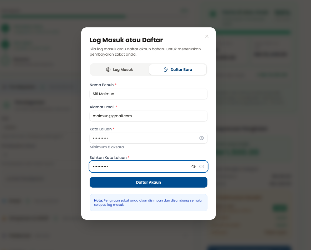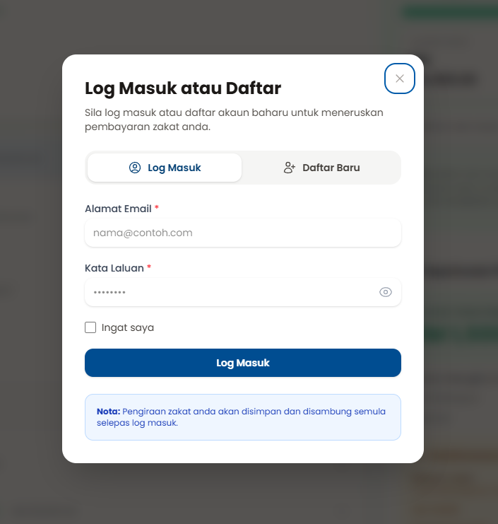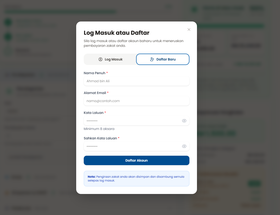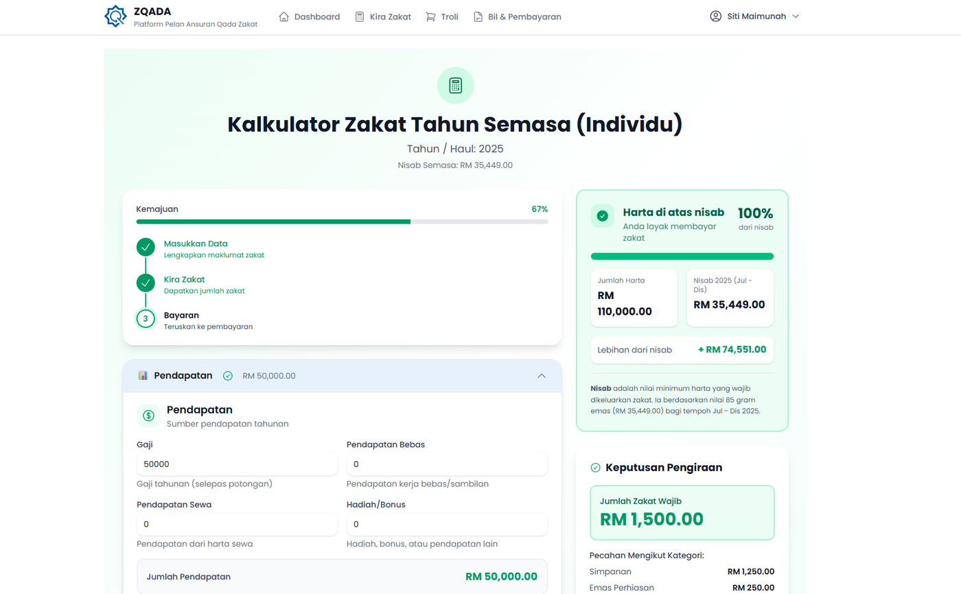 Langkah 2: Sistem akan memaparkan skrin kalkulator zakat untuk pengiraan.