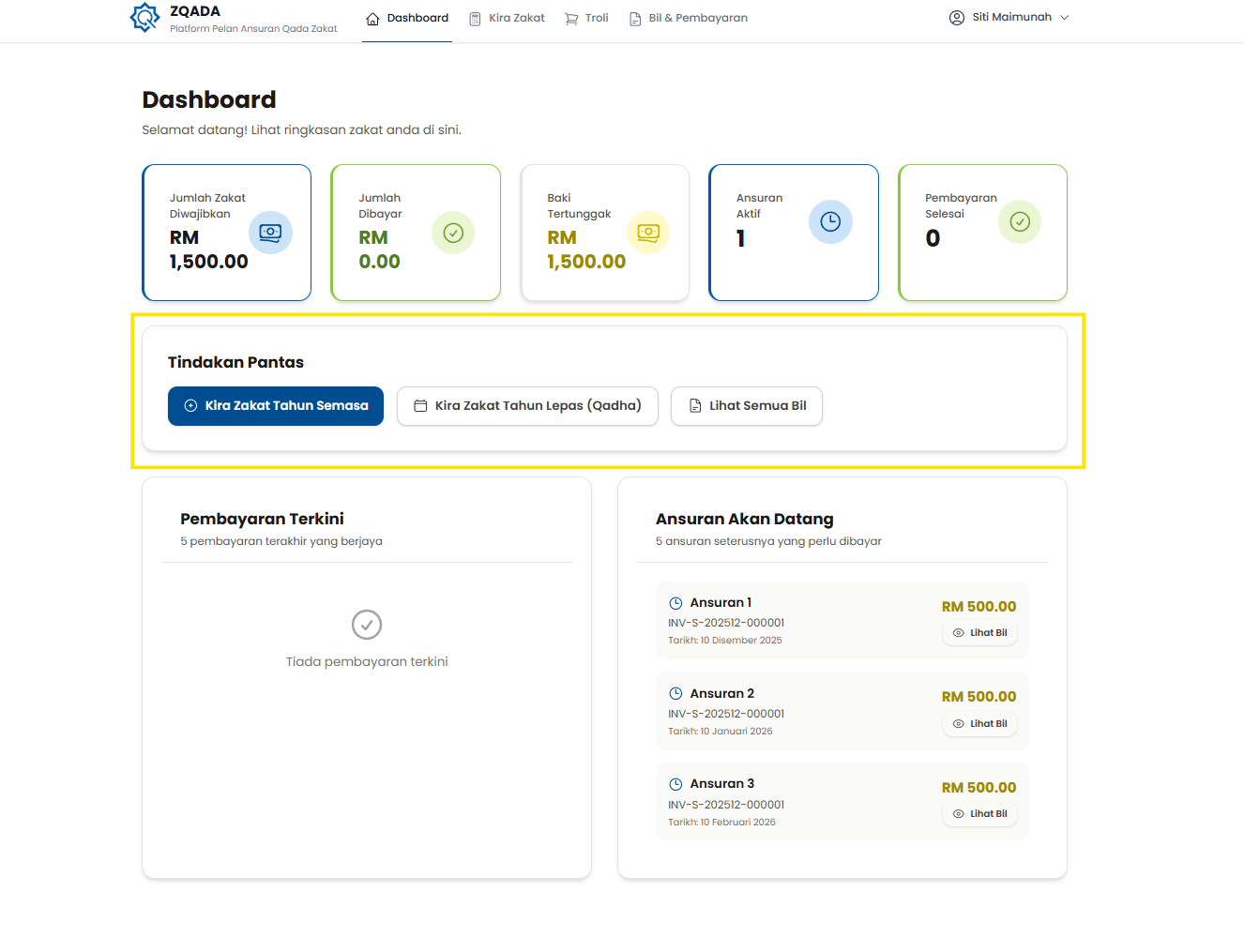 Langkah 3: Klik pada Tindakan Pantas untuk Pengiraan Zakat Tahun Semasa, Pengiraaan Zakat Tahun Lepas (Qadha) dan Lihat Semua Bil.