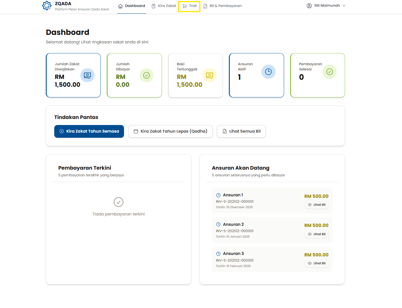 Langkah 2: Pengguna dapat melihat Ringkasan Zakat, Pembayaran Terkini dan Ansuran Akan Datang.